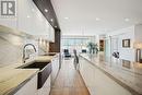 Welcome to Suite 601W at the iconic King's Landing-a masterpiece by celebrated Canadian architect Arthur Erickson, best known for Roy Thomson Hall. Nestled along Toronto's vibrant waterfront, this rare, quiet corner unit has been meticulously renovated, offering a unique blend of architectural prestige and modern luxury. Step through a spacious, elegant foyer into a thoughtfully redesigned home perfect for elevated everyday living and entertaining. The heart of the suite features a gourmet chef's kitchen with a striking 10-ft waterfall island, premium Miele appliances, and custom wine storage-flowing seamlessly into a large open-concept living and dining area. An expansive living room offers the perfect setting to host guests, while the bright solarium provides a private retreat to read, relax, or enjoy a glass of wine. The luxurious primary suite boasts a vast walk-in closet and spa-like ensuite with jetted soaker tub, dual vanities, and private water closet. A full-sized laundry room with built-in storage adds comfort and convenience. Ideally located on the same level as the building's exceptional amenities: indoor saltwater pool & whirlpool, sauna, rooftop terrace with BBQs, outdoor pickleball court, state-of-the-art gym, party room, and golf swing practice range. Includes 1 parking space and 1 locker. With 24-hour white-glove concierge service, premier finishes, and a landmark location, Suite601W is a rare opportunity to live in one of Toronto's most architecturally significant residences. (id:7525)